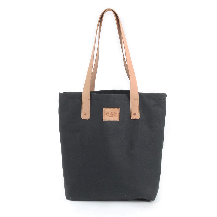 The Daily Tote is constructed from two layers of Duck Canvas. It's got an interior pocket and measures 16" wide by 15" tall and 4" deep with boxed corners. It features leather handles, long enough to hang from your shoulder, copper rivets and a leather patch. Handmade in Portland, Oregon.