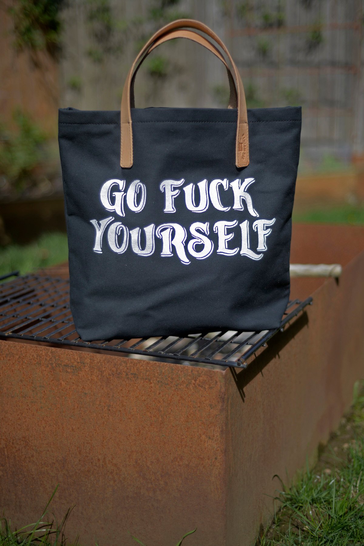 A heavy duty tote, screen printed on both sides. This one features a black canvas interior and short heavy leather handles for a hand carry. It's got an interior pocket and measures 16" wide by 15" tall and 4" deep with boxed corners. Made right here in Portland, Oregon.